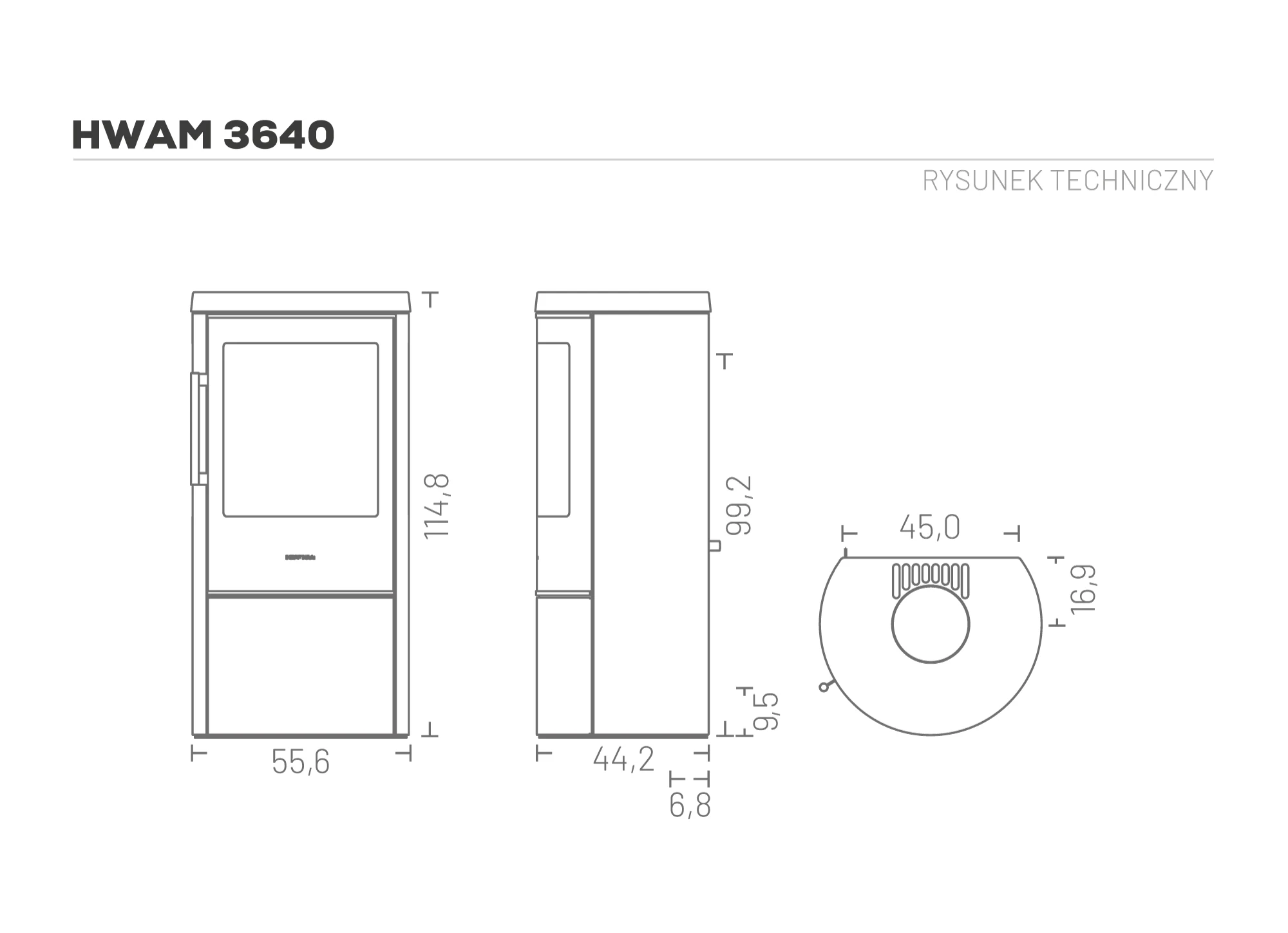 HWAM 3640 to ekologiczny piec opalany drewnem i wariant HWAM 3630 o tej samej wysokości i kształcie, ale bez bocznej szyby.