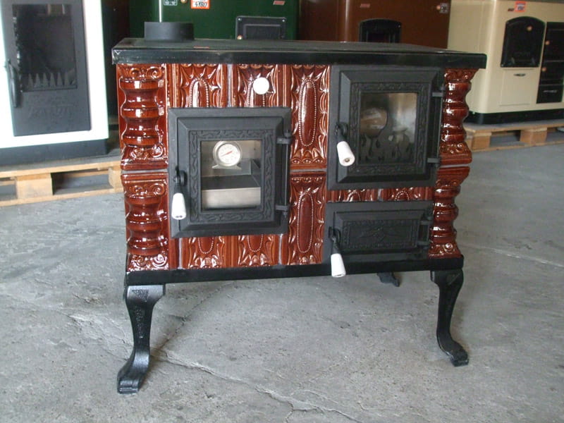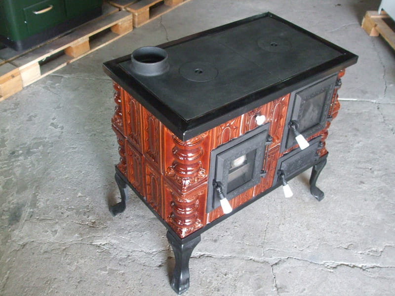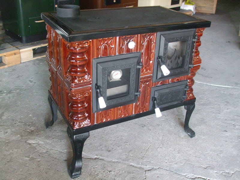 - ładny, estetyczny wygląd – wykonana z kafli ceramicznych, kształtek szamotowych, żeliwne nóżki, żeliwna płyta grzewcza, szkło ceramiczne w drzwiczkach paleniska i piekarnika,