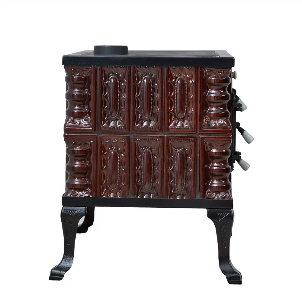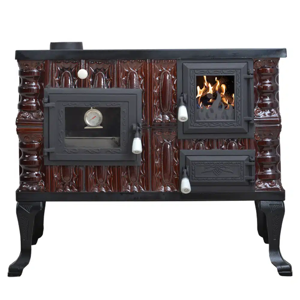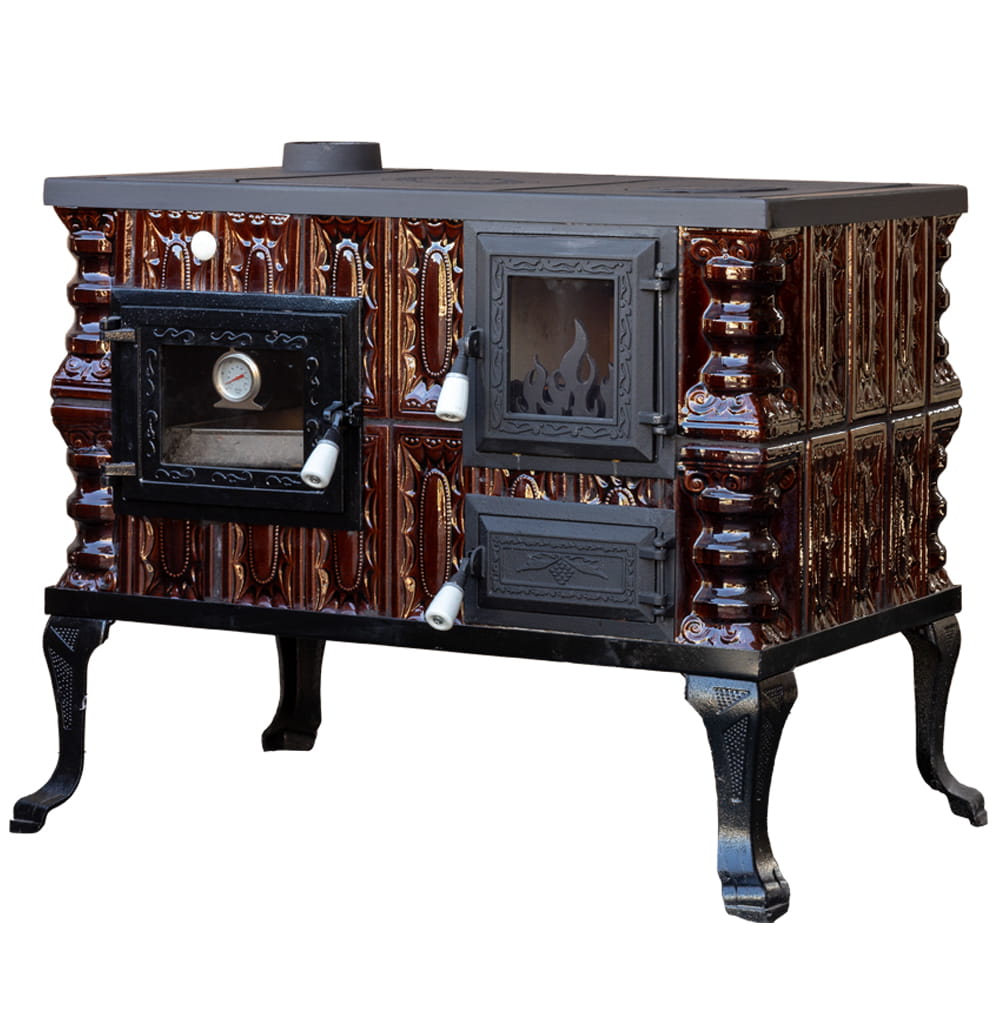 - ładny, estetyczny wygląd, typowy, klasyczny kształt – wykonana z kafli ceramicznych, kształtek szamotowych, żeliwne nóżki, żeliwne płyty grzewcze, szkło ceramiczne w drzwiczkach paleniska i piekarnika, dostępna w kolorze: brąz,