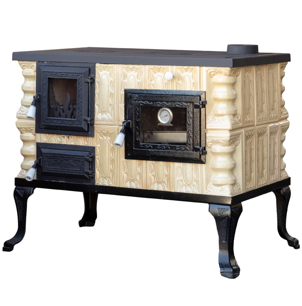 - ładny, estetyczny wygląd, typowy, klasyczny kształt – wykonana z kafli ceramicznych, kształtek szamotowych, żeliwne nóżki, żeliwne płyty grzewcze, szkło ceramiczne w drzwiczkach paleniska i piekarnika, dostępna w kolorze: krem,