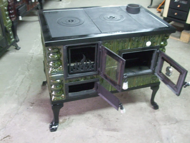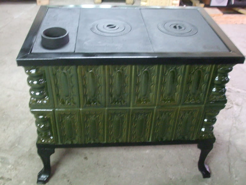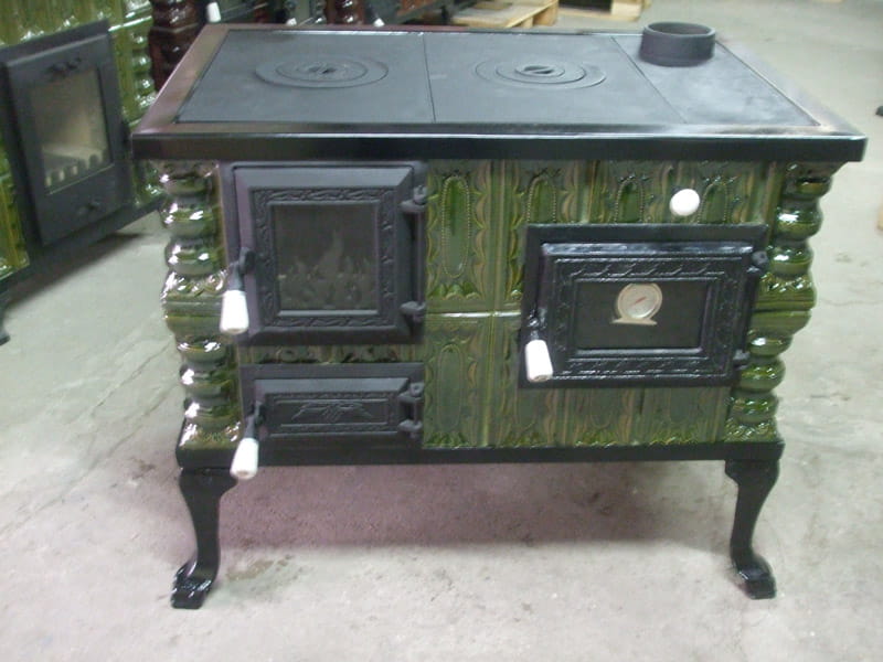 - ładny, estetyczny wygląd, typowy, klasyczny kształt – wykonana z kafli ceramicznych, kształtek szamotowych, żeliwne nóżki, żeliwne płyty grzewcze, szkło ceramiczne w drzwiczkach paleniska i piekarnika, dostępna w kolorze: zieleń butelkowa,