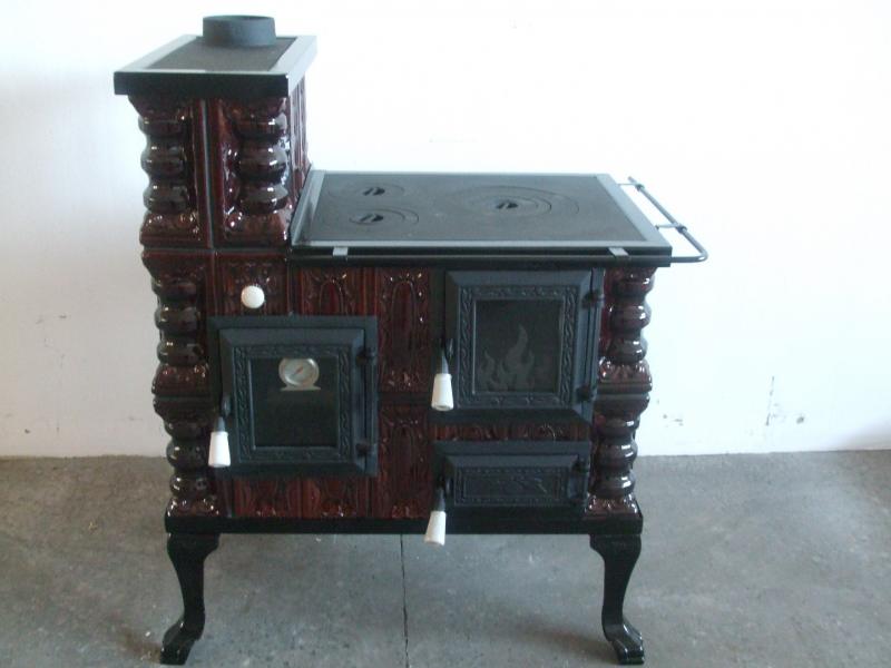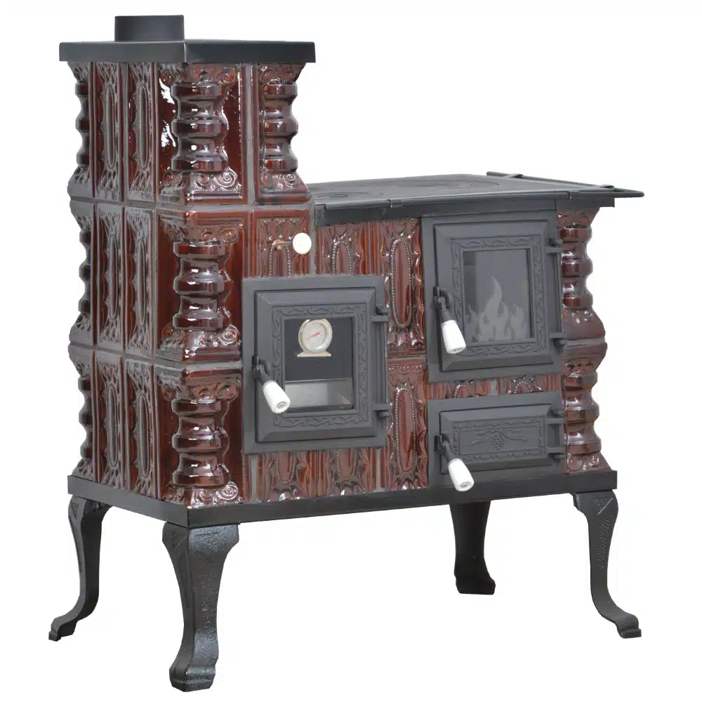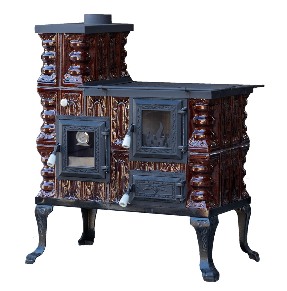 Kaflowa, przenośna kuchnia węglowa 3/2 K+S+S+ŻM brąz na paliwa stałe – preferowany opał: drewno, węgiel, brykiety - z piekarnikiem, przeznaczona do zamontowania w pomieszczeniach kuchennych, ogrzewająca powierzchnię do 80 m kw. (dane producenta ), umożliwia gotowanie i pieczenie potraw.
