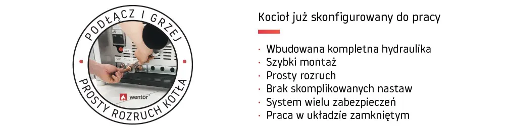 Kocioł wyposażony jest już w takie elementy jak pompa czy naczynie przeponowe do pracy w układzie zamkniętym. Jest gotowy do pracy wg zasady firmy Wentor “podłącz i grzej”.