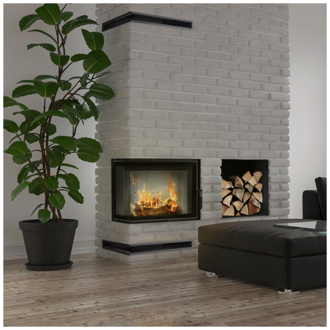 Wkład o ciekawym kształcie z bocznym przeszkleniem, z płytką komorą spalania, dzięki czemu doskonale sprawdzi się w salonach o niewielkiej powierzchni oraz małym zapotrzebowaniu na moc grzewczą. Dzięki dwustronnej wizji ognia i delikatnej ramie frontowej doskonale wpisuje się w stylistykę nowoczesnych wnętrz. Nowoczesne rozwiązania zastosowane w kominku gwarantują oszczędność energii i sprawiają, że obsługa i czyszczenie urządzenia są bezproblemowe.