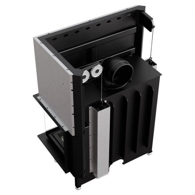Dodatkowo we wkładzie zastosowany jest system czystej szyby (kurtyna powietrza), czyli powietrze dostarczane jest bezpośrednio na szybę poprzez system kanałów umieszczonych na bokach kominka . W ten sposób dostarczany jest tlen do górnej części komory spalania, w której następuje dopalanie gazów powstałych w procesie spalania drewna, co dodatkowo ogranicza emisję szkodliwego CO do atmosfery.