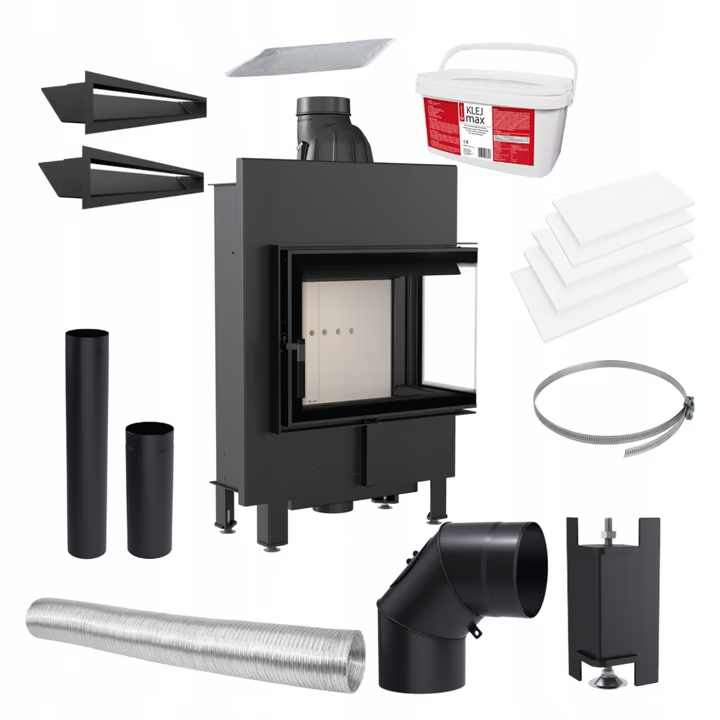 Stalowy wkład kominkowy narożny LUCY 12 SLIM prawy BS 8kW z płytką komorą spalania i ozdobną szybą + ZESTAW MONTAŻOWY