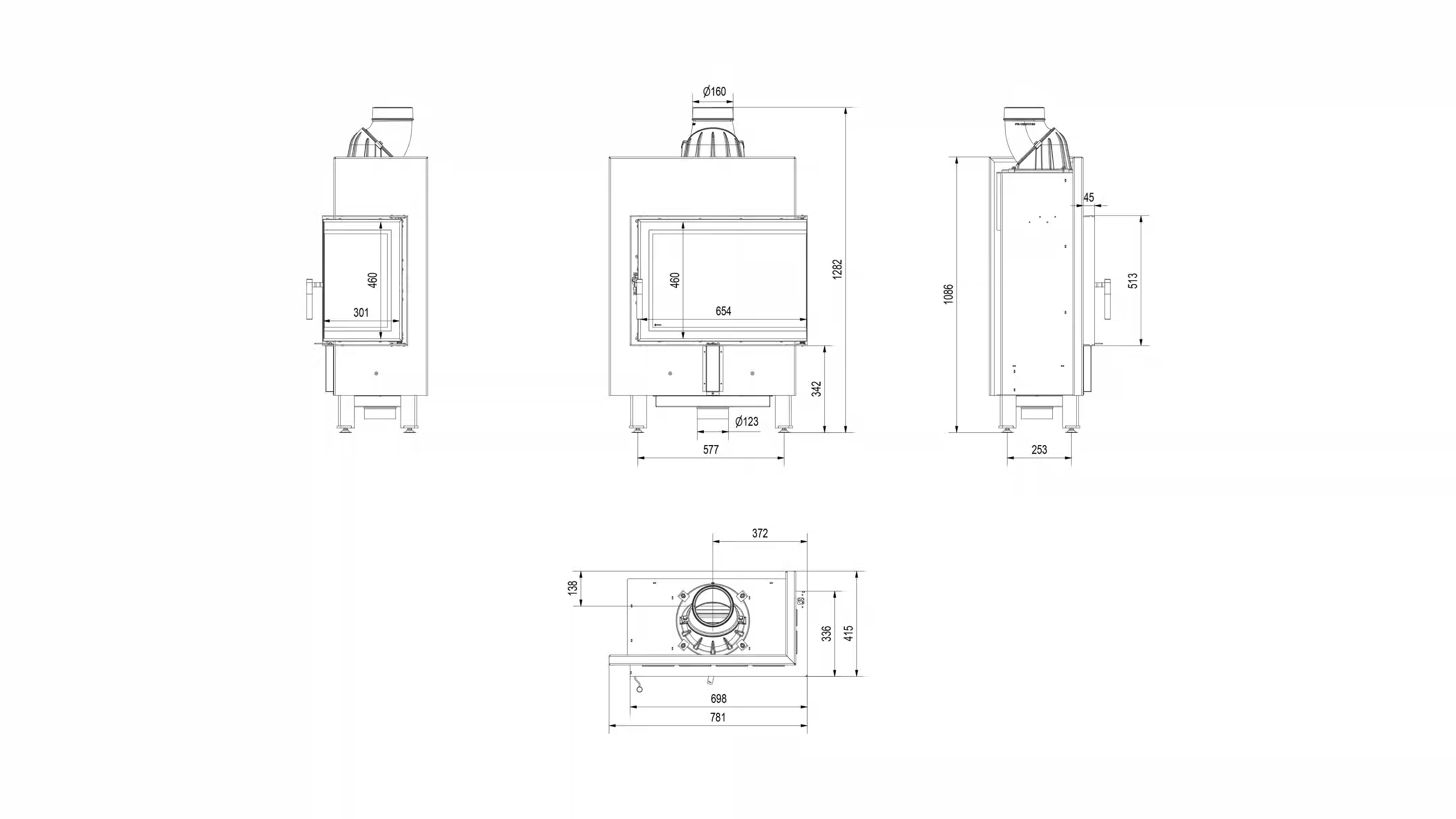 Kominek powietrzny stalowy LUCY SLIM prawy BS 8 kW Ø 160 zestaw montażowy