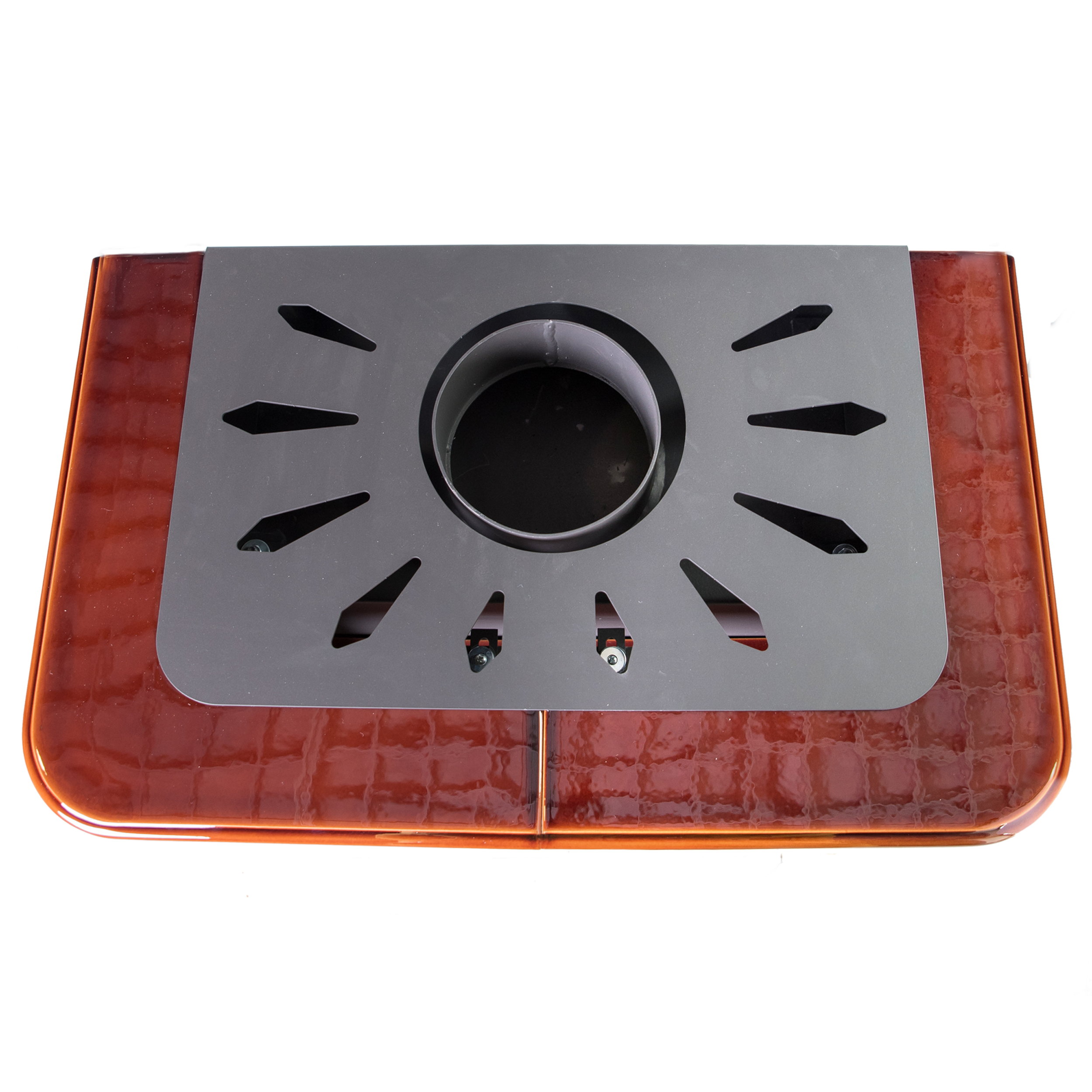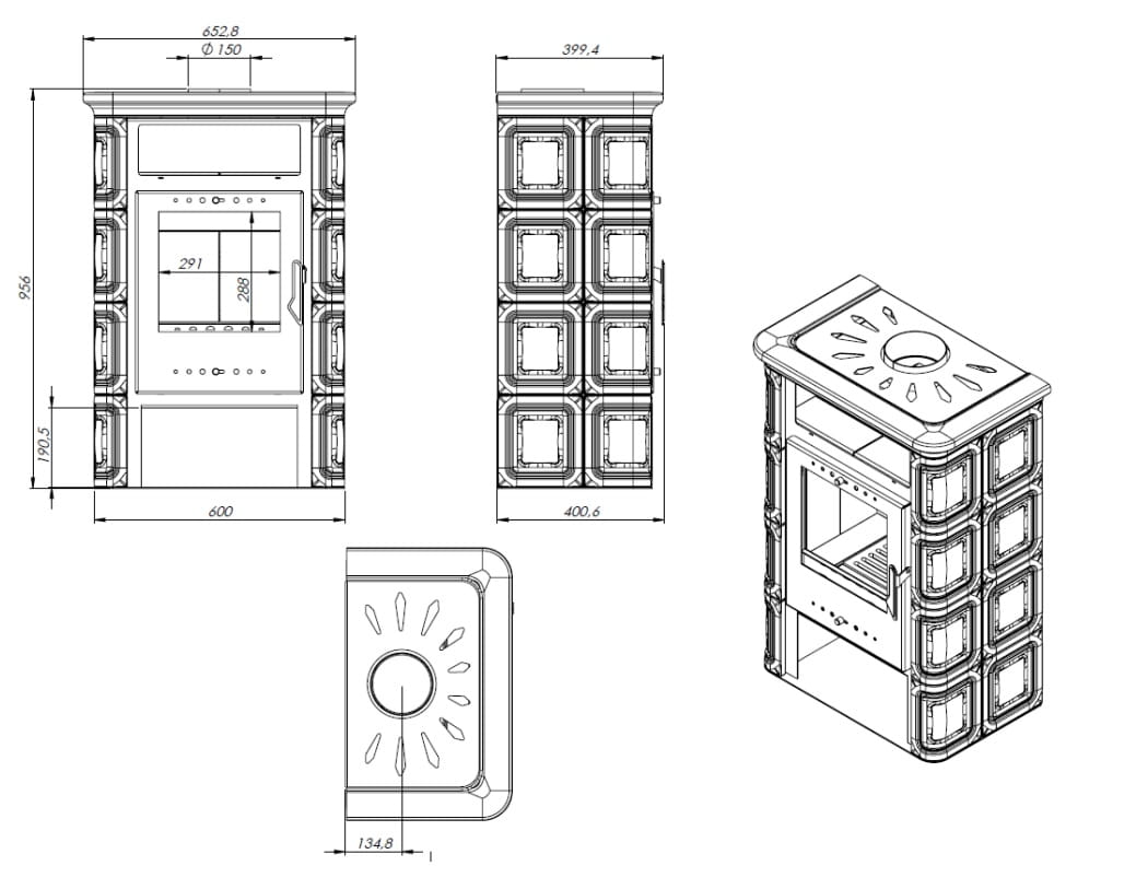Piec wykonany jest ze stali oraz kafli ceramicznych w kolorze: brąz. Posiada regulację powietrza wtórnego i pierwotnego. Komora paleniska wyłożona jest wermikulitem (góra i boki) i szamotem (dół wokół rusztu). Kompaktowe wymiary sprawiają, że piec może być zamontowany w każdym wnętrzu. Piec wyposażony jest w deflektor, ruszt oraz popielnik. W komplecie znajduję się rękawica termiczna oraz instrukcja obsługi.