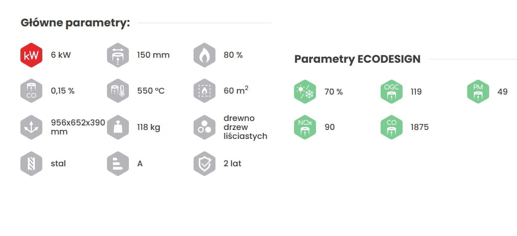 | Moc Nominalna | 6 kw (ogrzewa 60 m2) |