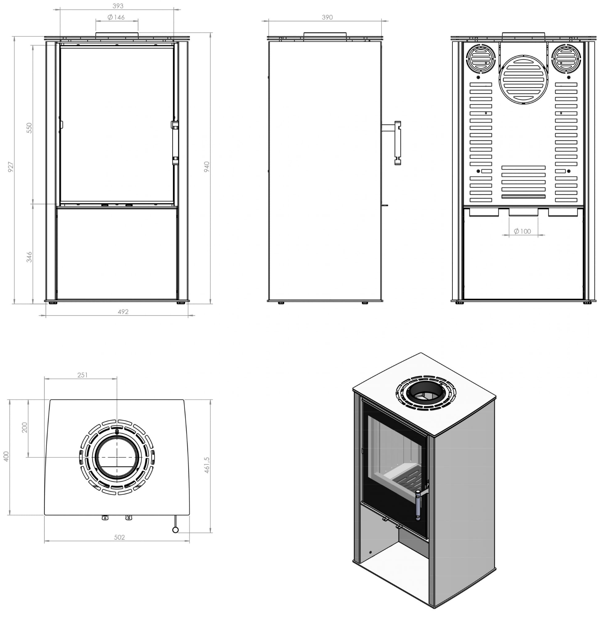 Najmniejszy piec opalany drewnem z serii LUPO, czyli model S jest wyposażony w łatwo wyjmowany popielnik zapewniający komfortowe użytkowanie. Bezpośrednio nad nim znajduje się solidny ruszt wykonany z żeliwa. Sposób montażu wylotu spalin może być dostosowany do indywidualnych potrzeb użytkownik. Konstrukcja kominka wolnostojącego umożliwiają podłączenie wylotu spalin zarówno w tylnej, jak i w górnej części solidnego korpusu.