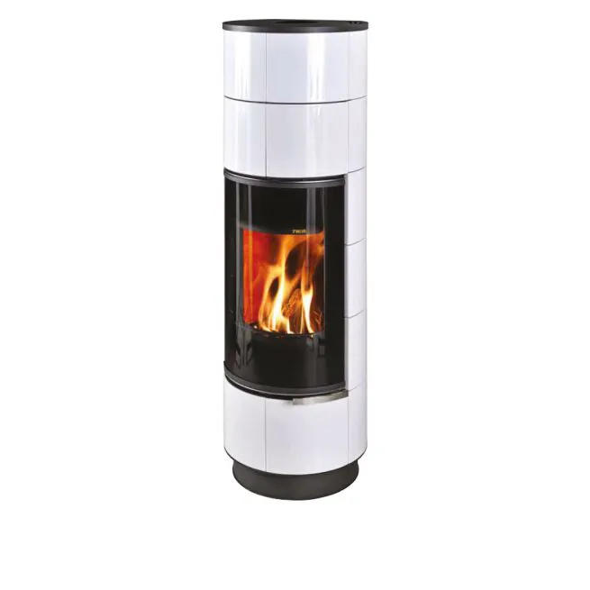 Wnętrze wyłożone wermikulitem dla zapewnienia skutecznego i czystego spalania drewna. Wykonany z blachy pomalowanej proszkowo na kolor czarny oraz pięknych białych kafli. Idealnie wpasowuje się w nowoczesne i minimalistyczne wnętrza. Zintegrowany panel konwekcyjny umożliwia umiejscowienie pieca w bliskiej odległości od ściany.