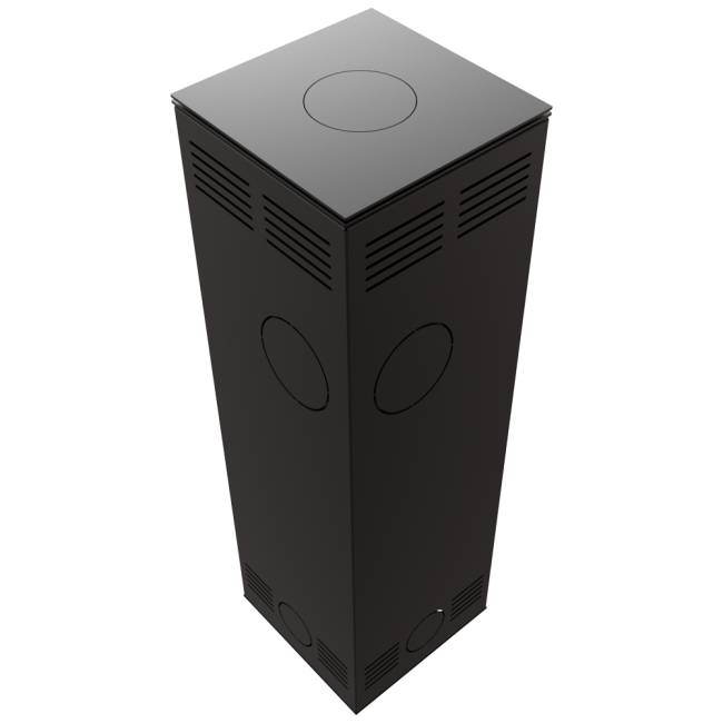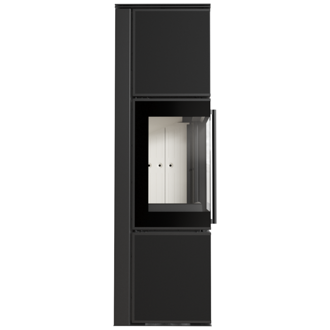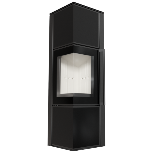 TORA w rozmiarze M to piec stalowy wykończony płytą ze spieku kwarcowego w eleganckim kolorze Nero Assoluto i dwustronnym przeszkleniem. Wyposażony w narożne drzwi ozdobione czernionym przeszkleniem, dla pogłębienia wizji ognia.