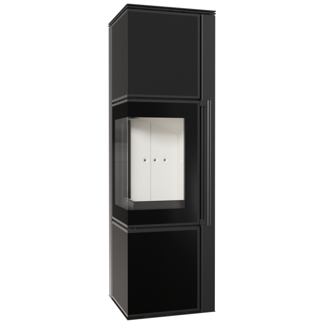 Przestronne przeszklenie uatrakcyjnia wizję ognia, a dodatkowa ozdobna szyba typu glass podkreśla jego urok. Wnętrze pieca wyłożone TERMOTEC doskonale kontrastuje z bryłą, nadając całości nowoczesnego wyglądu.