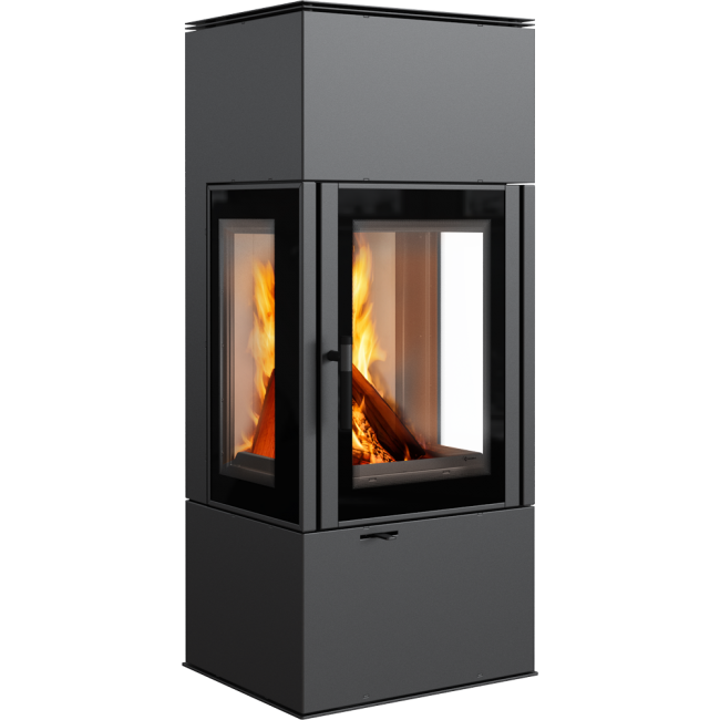 Trójstronne przeszklenie uatrakcyjnia wizję ognia, a dodatkowa ozdobna szyba typu glass podkreśla jego urok. Wnętrze pieca wyłożone TERMOTEC doskonale kontrastuje z bryłą, nadając całości nowoczesnego wyglądu.