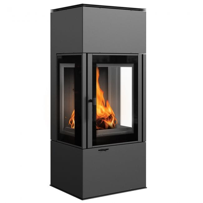 Trójstronne przeszklenie uatrakcyjnia wizję ognia, a dodatkowa ozdobna szyba typu glass podkreśla jego urok. Wnętrze pieca wyłożone TERMOTEC doskonale kontrastuje z bryłą, nadając całości nowoczesnego wyglądu.