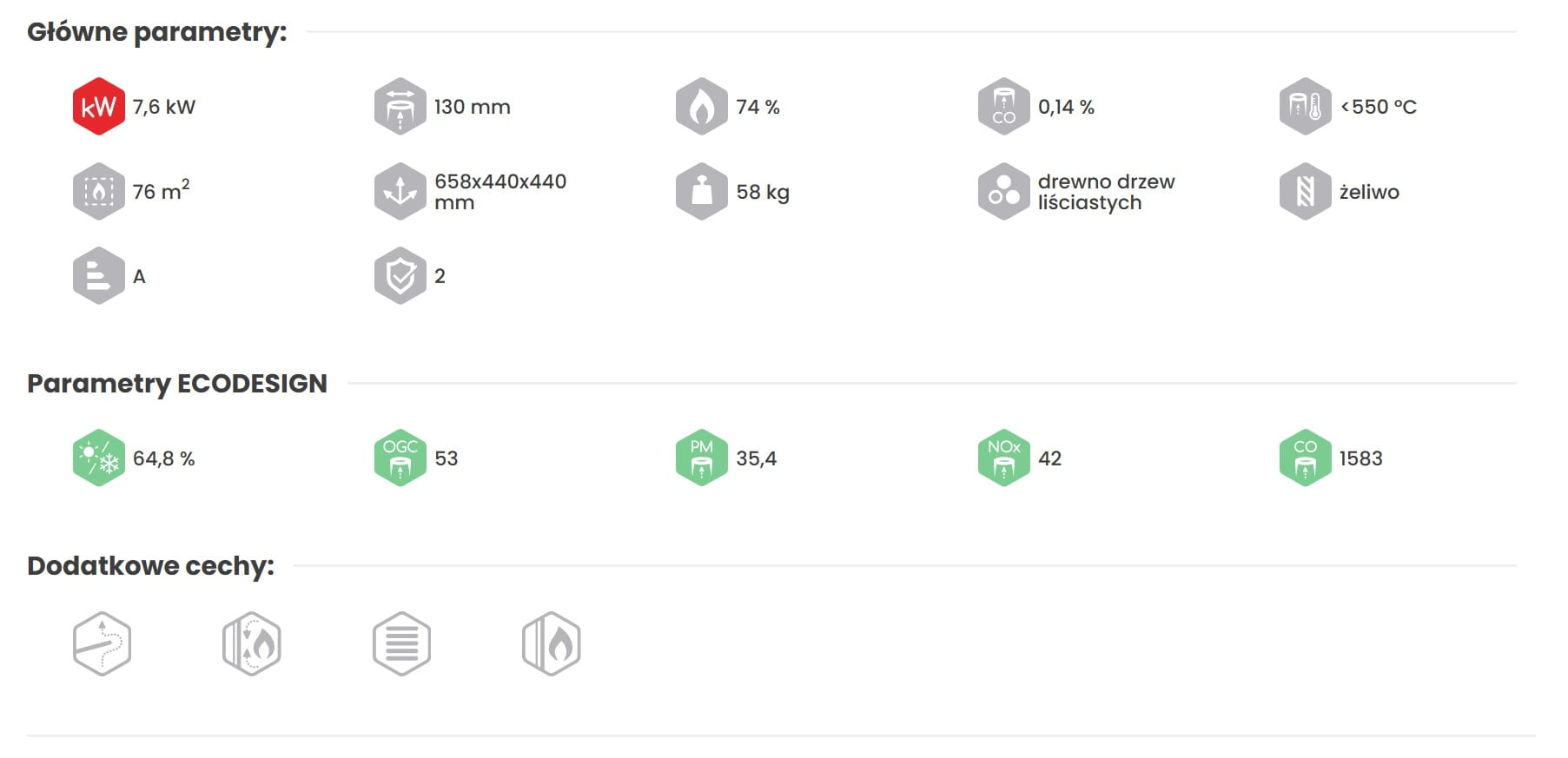 Piec wyposażony jest w żeliwny deflektor, ruszt oraz popielnik. W komplecie znajduję się rękawica termiczna oraz instrukcja obsługi.
