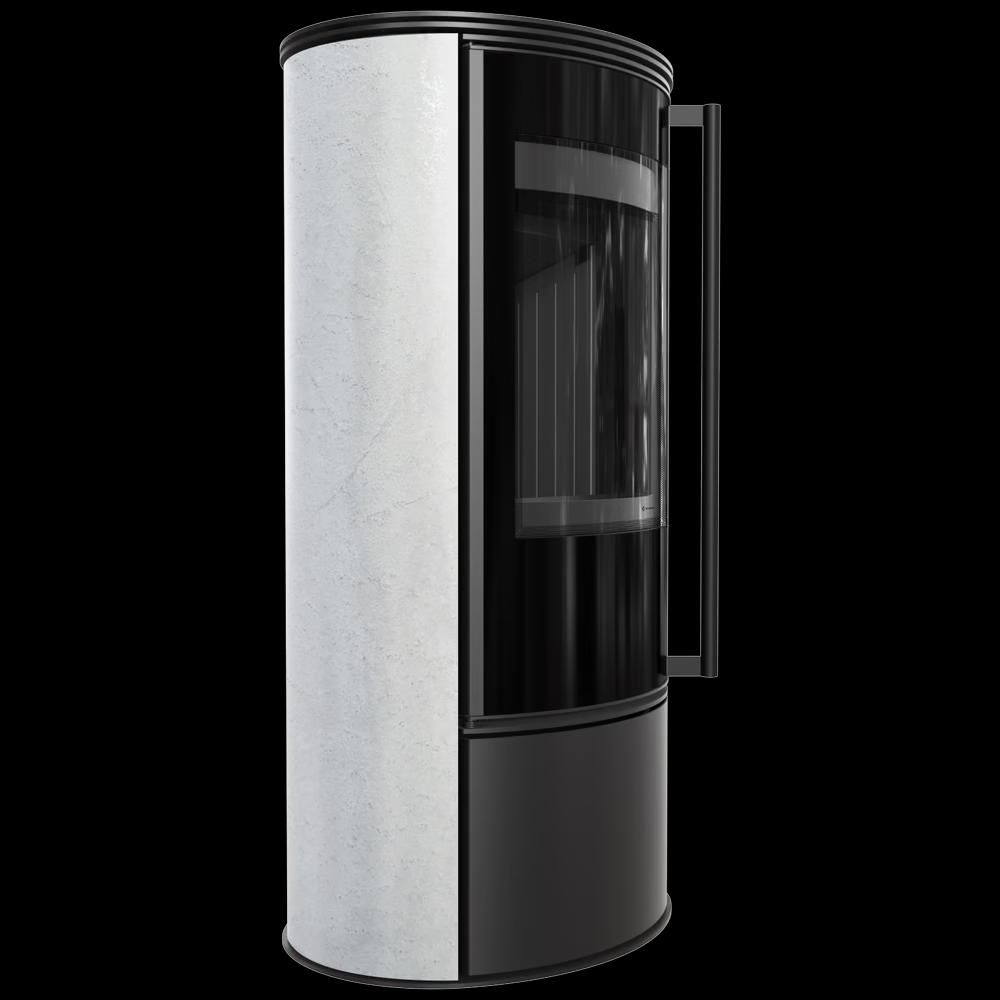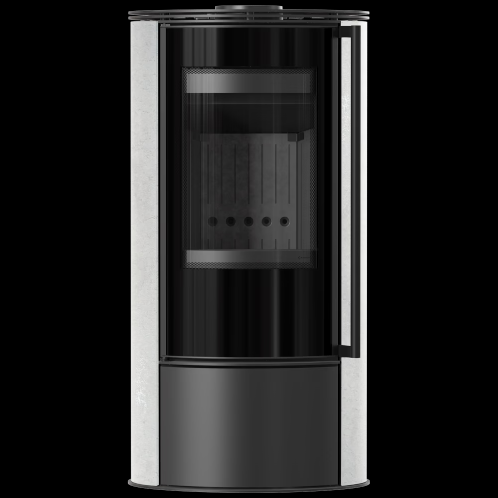 Piec stalowy ERIK Ø 150 5,5 kW ozdobna ceramika akumulacyjna WHITE NATURAL czarne wyłożenie