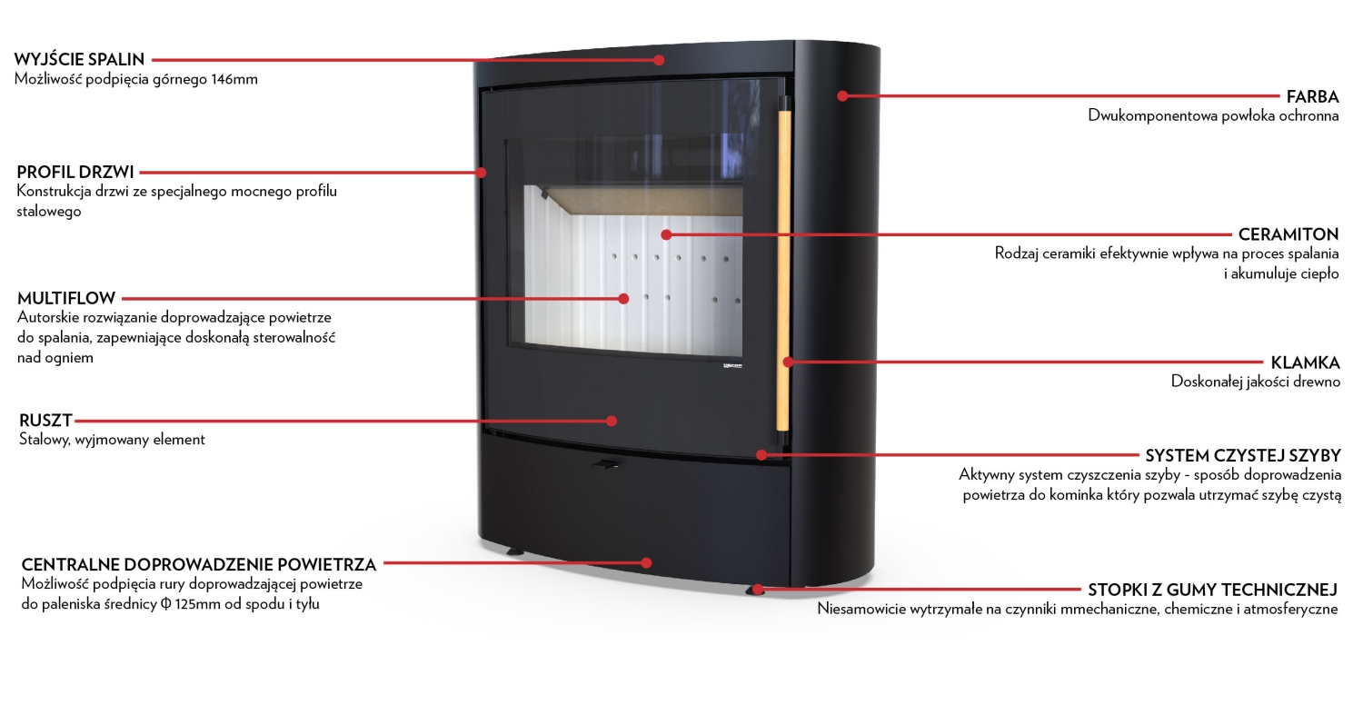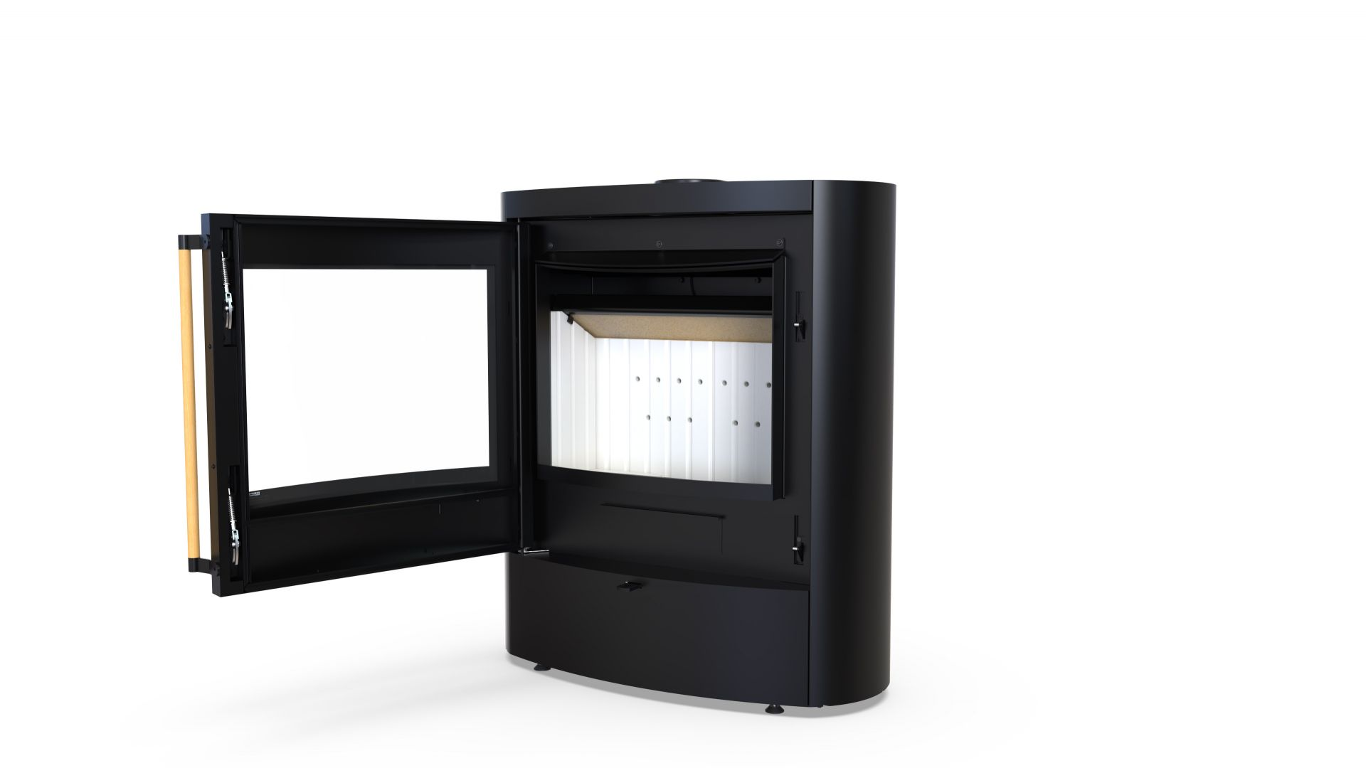 Eliptyczny kształt piecyka w połączeniu z szybą Black Line nadaje SEDNIE nowoczesnego wyglądu. Drewniana klamka, oparta na ślizgowym mechanizmie nadaje naturalnego charakteru piecykowi, a sposób zamykania zapewnia prostotę użytkowania. Piecyk zapewnia niskoemisyjne ciepło w domu, nie zabierając jej przestrzeni, wystarczy tylko: 8 cm. Duża komora spalania wyłożona trwałym ceramitonem zapewnia szeroką wizję ognia, jedocześnie nie przegrzewając pomieszczenia.