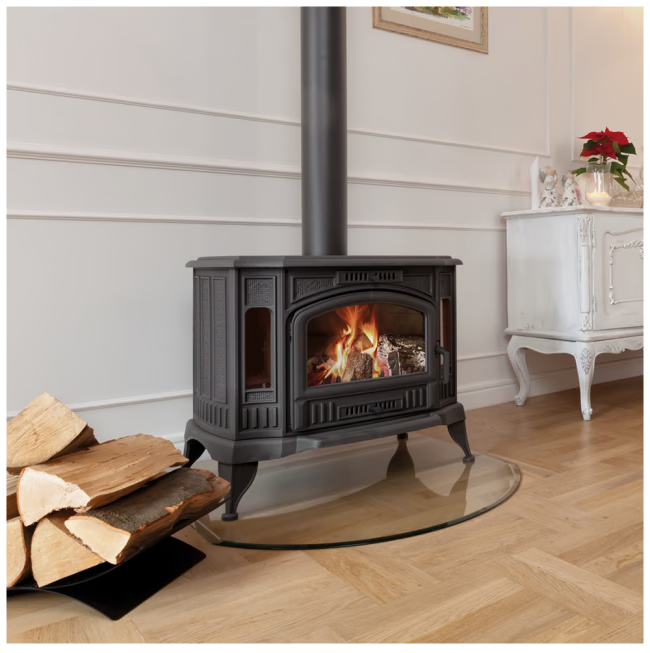 Posiada szybę żaroodporną wytrzymującą temperaturę do 660°C.