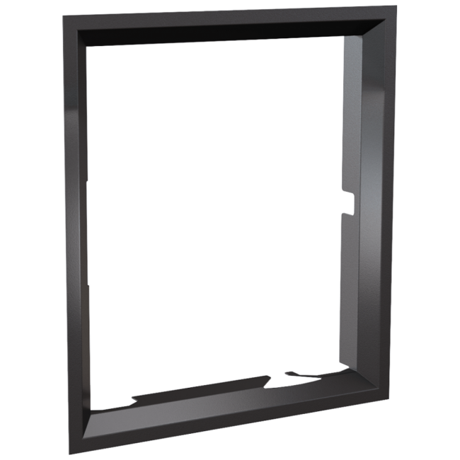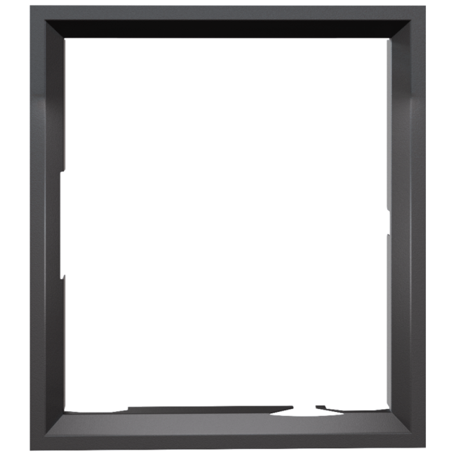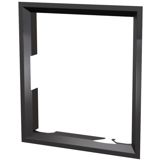 Nowoczesna stalowa ramka ozdobna do wkładu kominkowego NADIA 8 z prostym frontem oraz drzwiami otwieranymi prawostronnie (zawiasy po prawej stronie) po przełożeniu drzwi.