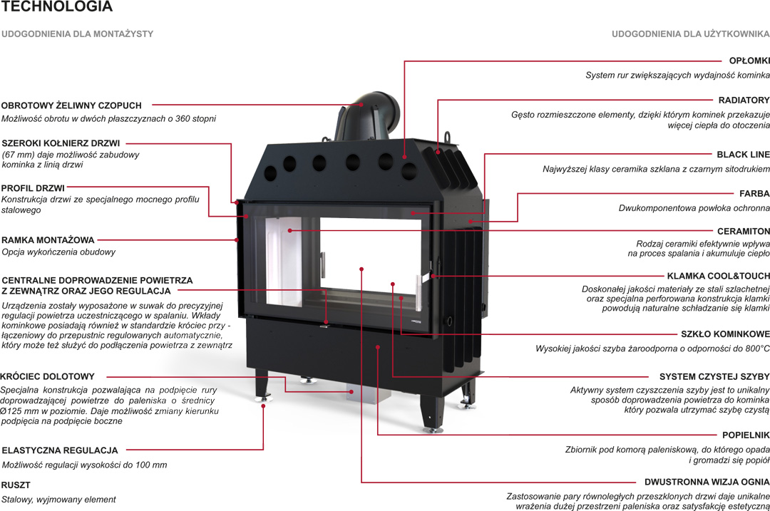 - autorski skład mieszanki szamotowej THERMOBLOCK (oddawanie zakumulowanego ciepła także po zakończeniu palenia we wkładzie)
