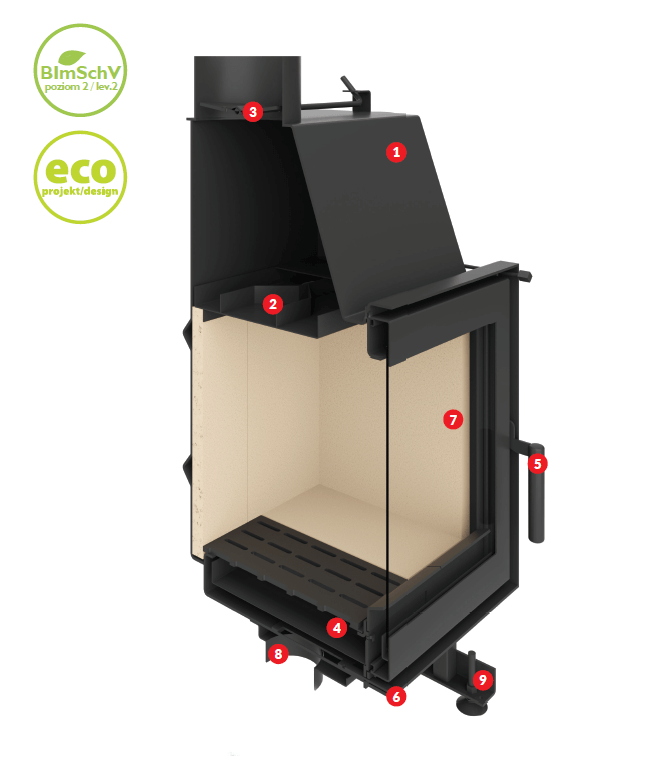 Dwupłaszczowa konstrukcja wkładów ECO składa się z korpusu wkładu wykonanego ze stali oraz wewnętrznych elementów szamotowych. Wewnętrzne elementy paleniska są odporne na bardzo wysokie temperatury i wykonane z wysokiej jakości szamotu, o bardzo dobrych właściwościach akumulacji ciepła – dzięki temu ciepło jest oddawane jeszcze długo po wygaśnięciu ognia w kominku. Wszystkie części wewnątrz paleniska podlegające zużyciu są łatwo dostępne, a ich wymiana bardzo prosta. Stalowy, szczelny korpus zewnętrzny wkładów ECO jest wzmocniony przetłoczeniami. Konstrukcja taka gwarantuje solidność urządzenia i bezpieczeństwo obsługi, nawet przy paleniu w kominku non-stop.
